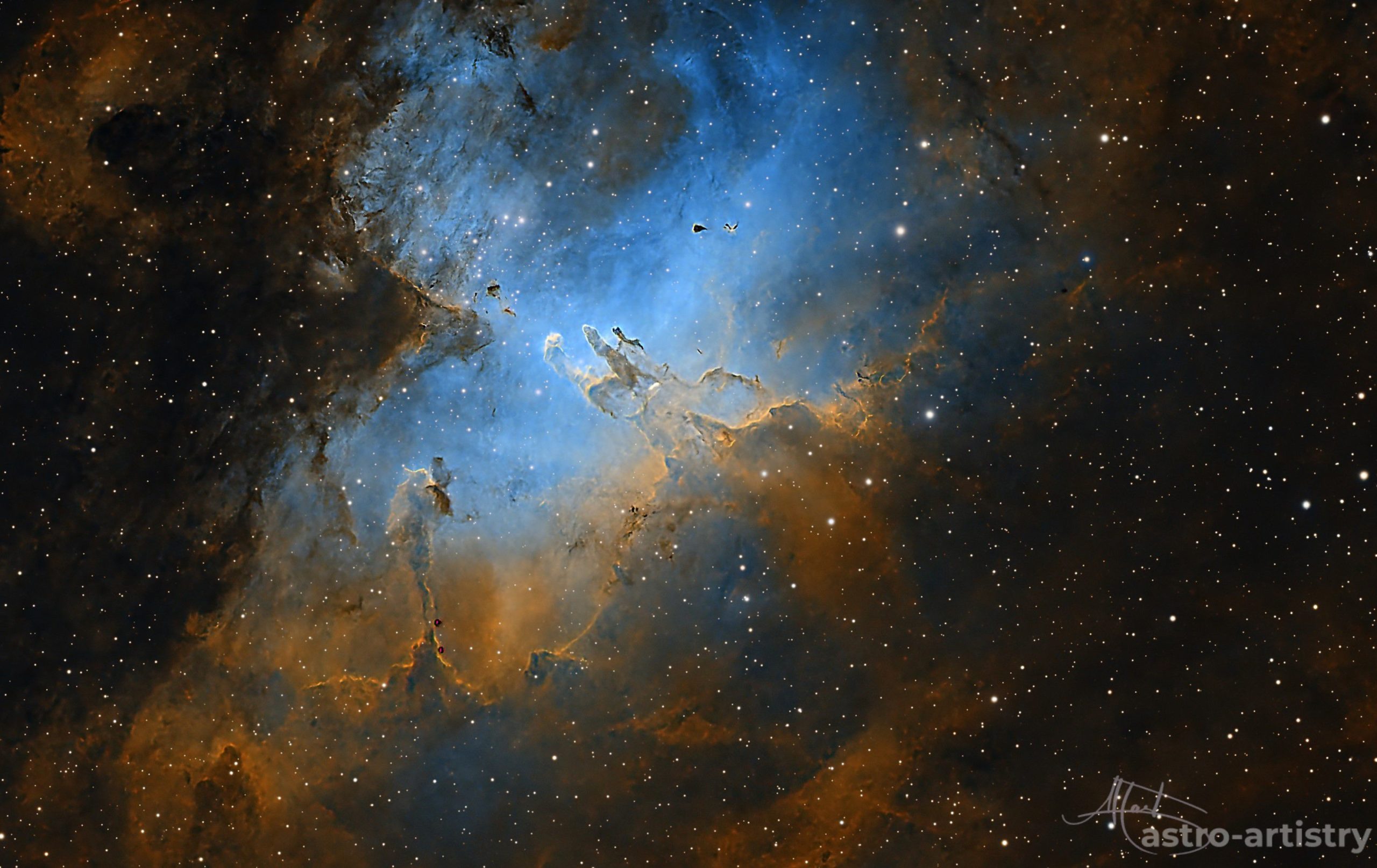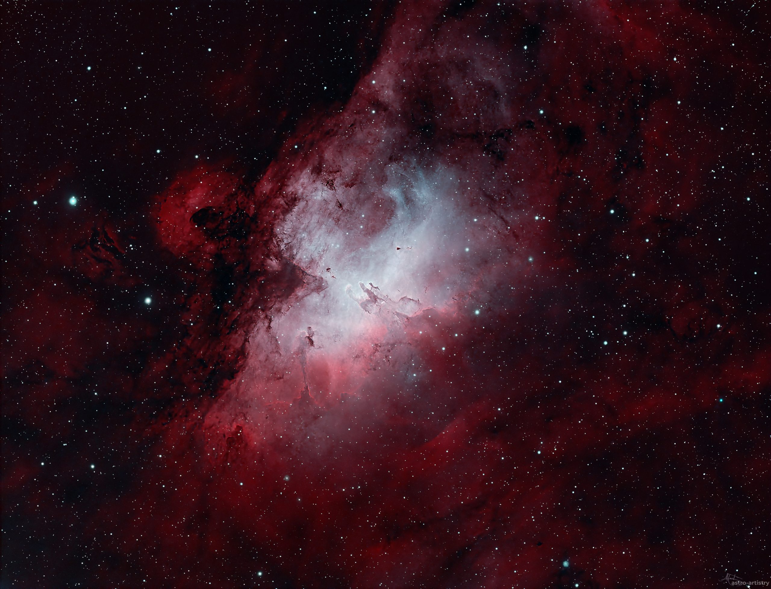M16 - Cropped - Captured on the PlayerOne Poseidon-M , 130FF , f7/7, ZWO 7nm Narrow band filters- Hydrogen Alpha and Oxygen III and Sulphur II. This image was captured on 24 August 2025
