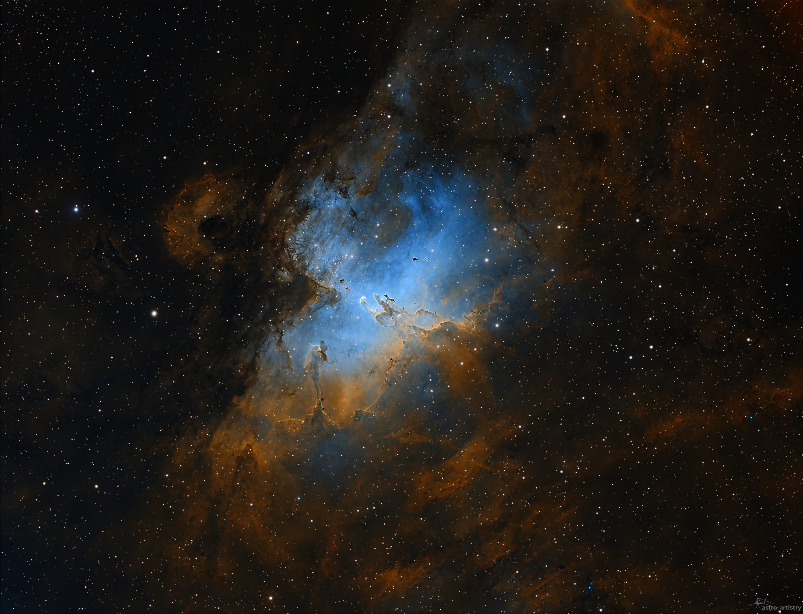 M16 - Captured on the PlayerOne Poseidon-M , 130FF , f7/7, ZWO 7nm Narrow band filters- Hydrogen Alpha and Oxygen III and Sulphur II. This image was captured on 24 August 2025