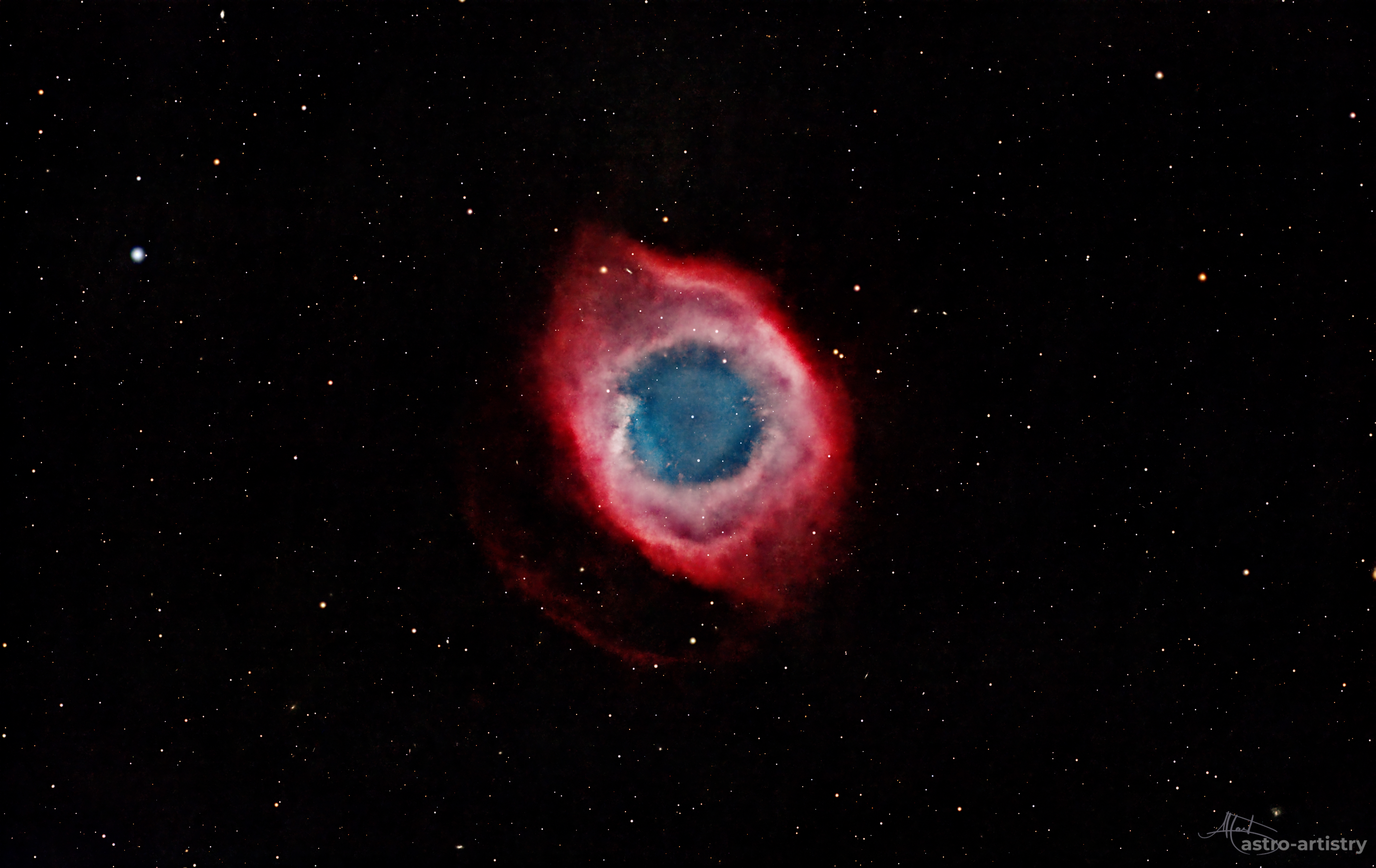 NGC 7293 aka Helix Nebula, is a planetary nebula located in the constellation Aquarius. This planetary nebula is one of the closest of all the bright planetary nebulae to Earth.At about 655 light-years awy, it is similar in appearance to the Cat's Eye Nebula and the Ring Nebula. The Helix Nebula has sometimes been referred to as the "Eye of God"